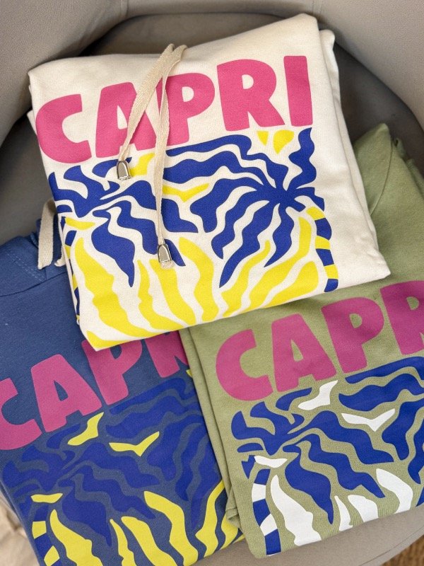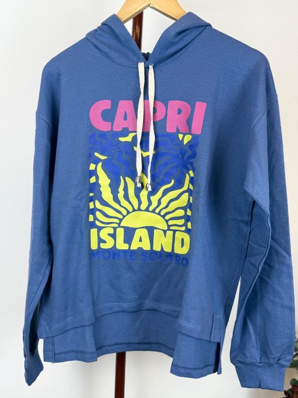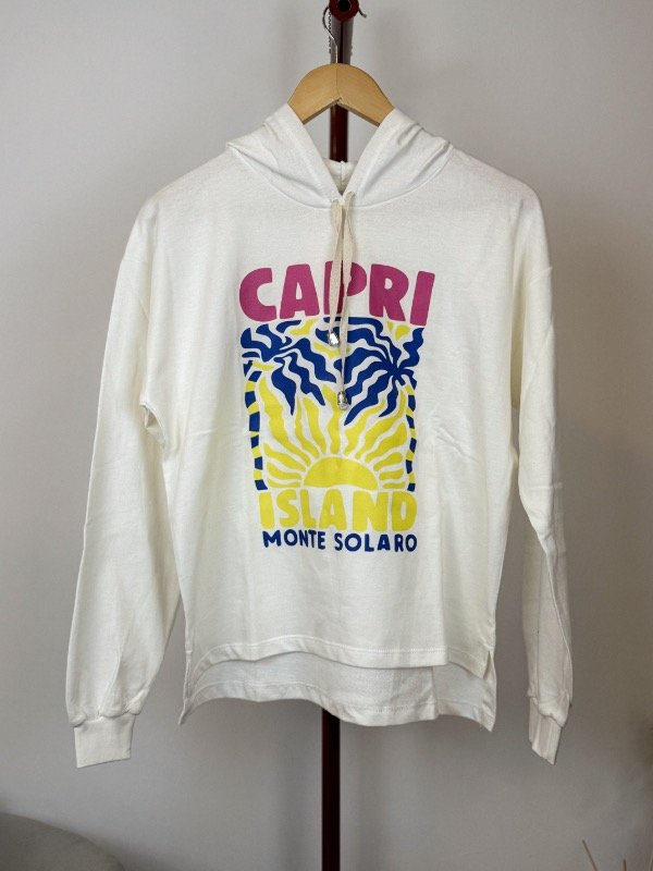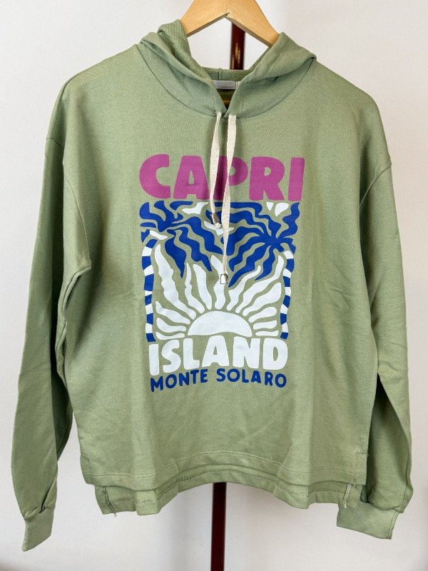 Buzo de rústico 100% algodón, con capucha, estampado en la parte delantera. Más corto adelante que atrás.