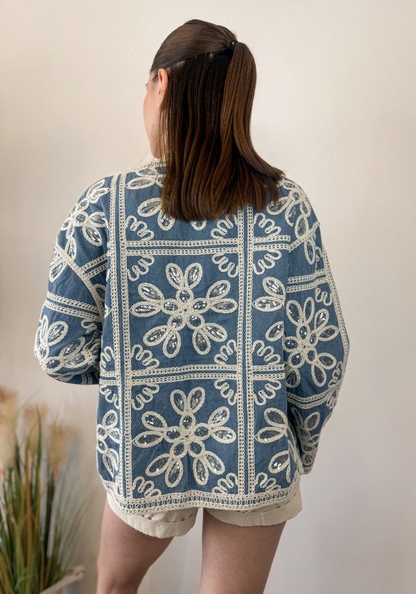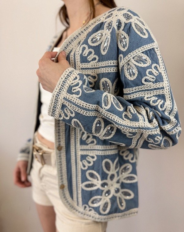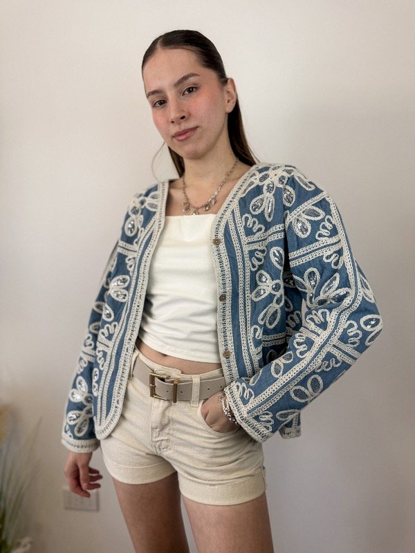 Confeccionada en denim camisero, esta chaqueta ofrece una textura resistente y suave, ideal para realzar cualquier look de temporada. Su cuello en V aporta un aire moderno y estilizado, mientras que el cierre delantero con botones asegura practicidad sin perder elegancia. Lo que realmente distingue a la Chaqueta Yelena es su exquisito bordado realizado en hilo de algodón y lentejuelas, presente en todo su diseño. Cada detalle bordado ilumina la prenda, creando un efecto cautivador que convierte a esta chaqueta en el centro de todas las miradas. Perfecta para quienes buscan destacar y expresar su personalidad, la Chaqueta Yelena es la elección ideal para sumar diseño, creatividad y un toque de brillo a tu guardarropa.
