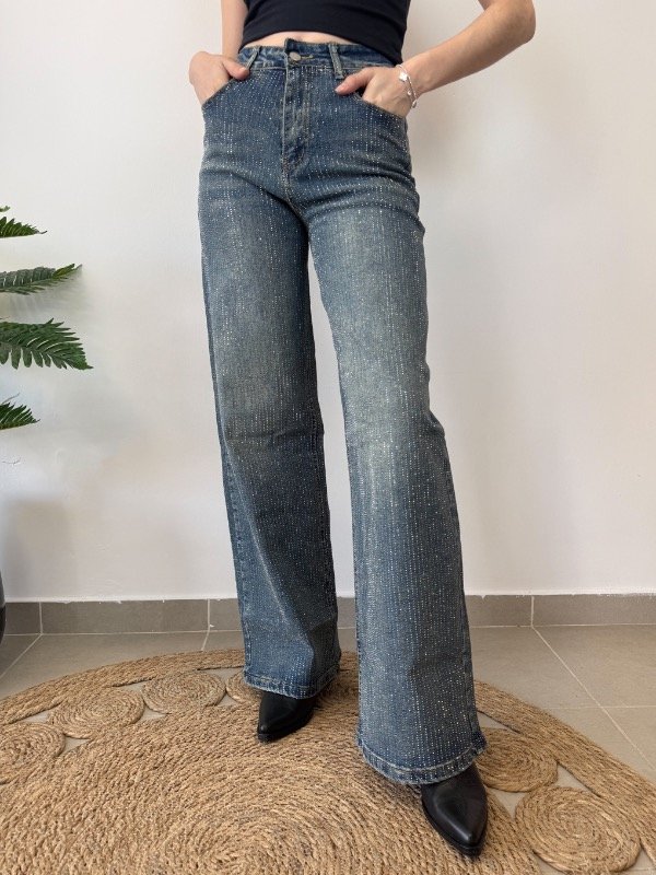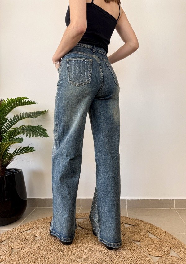 Sumale brillo a tus looks con este jean wide leg tiro alto, confeccionado en denim suave y cómodo. Tiene un lavado clásico y detalles de strass distribuidos en las piernas y bolsillos, que le dan un toque moderno y canchero sin perder versatilidad.