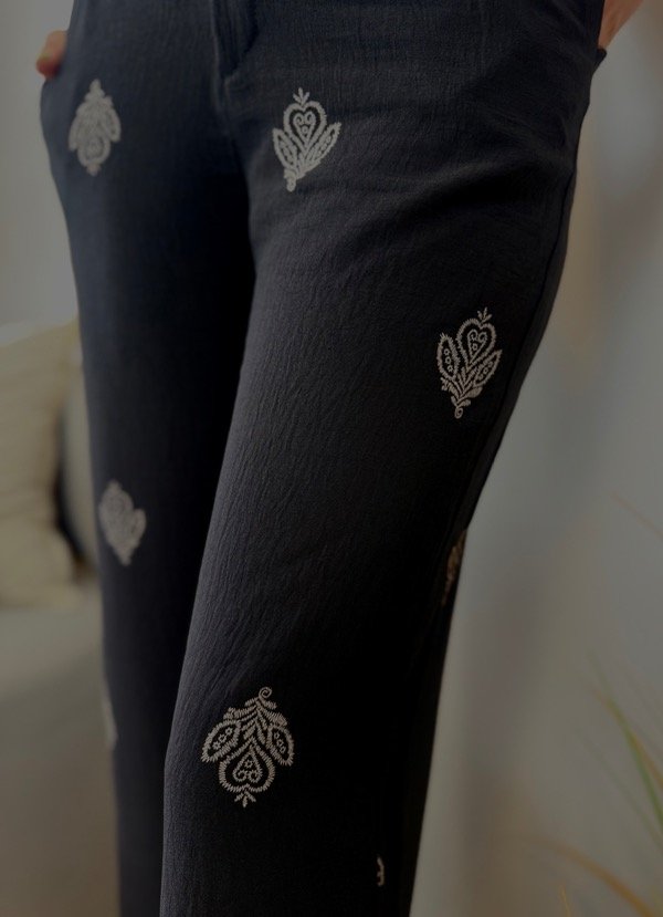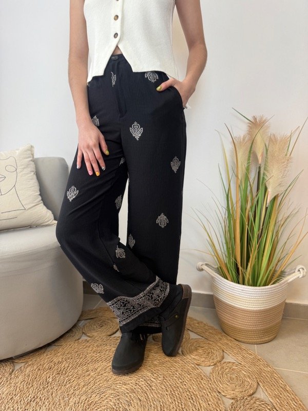 Descripción : Palazo de tiro medio, con detalle de estampa guarda en la botamanga. Cintura con elástico, abertura frontal con cierre y botón.