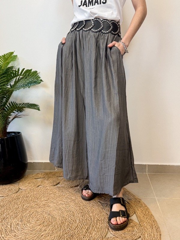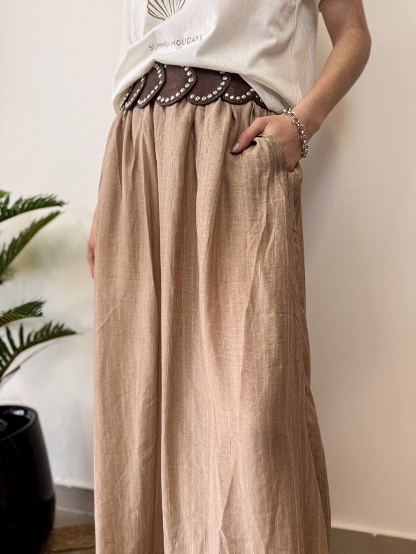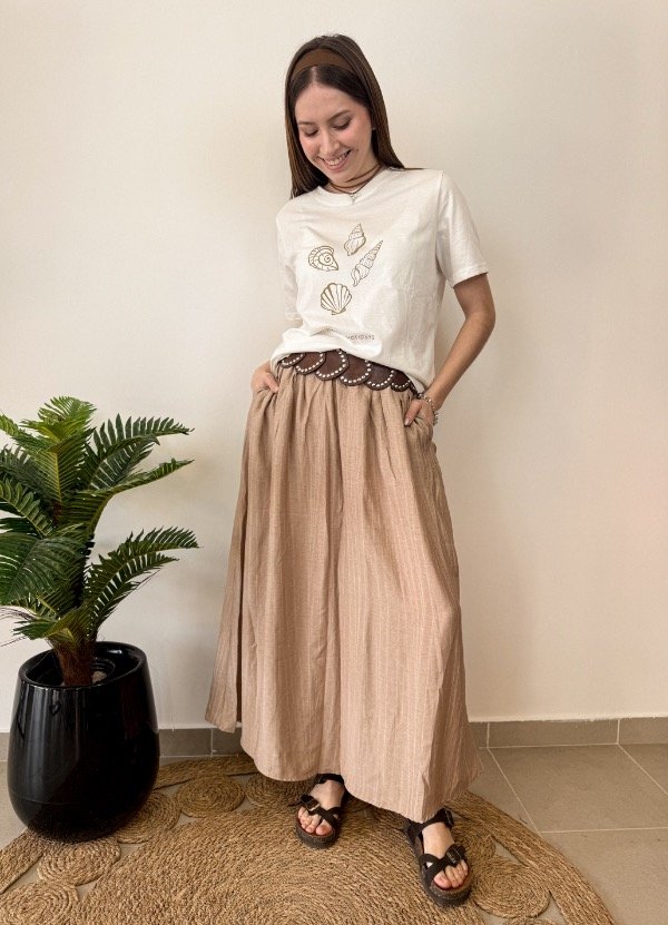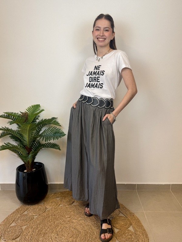 Descripción : Pollera larga con vuelo. De cintura fija y frunces. Apertura lateral con cierre invisible.