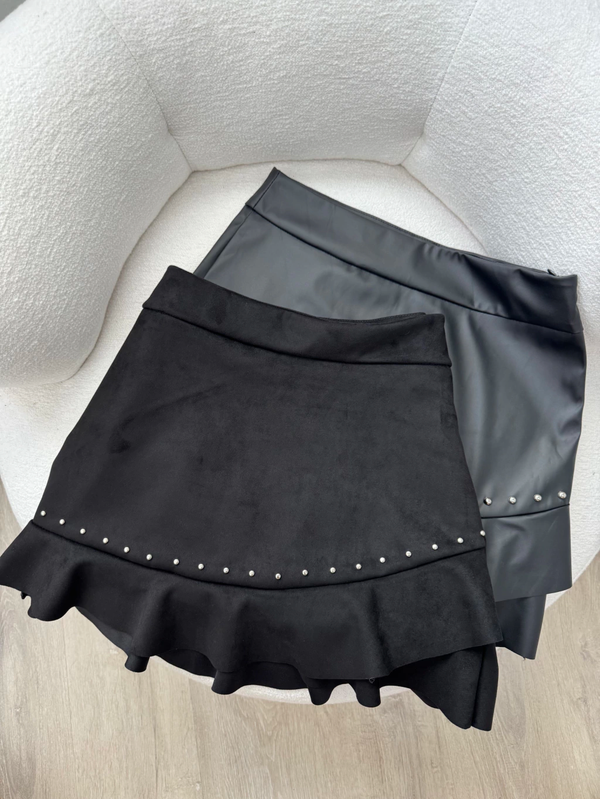 Pollera de gamuza con recorte de volado y tachas en parte inferior. Ideal para lucir con texanas, borcegos o sandalias