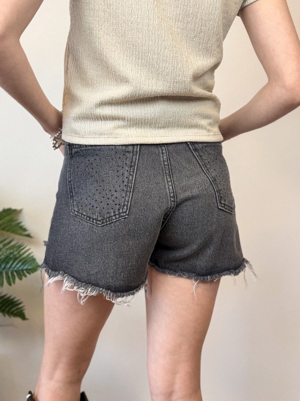 El Short Mariana tiene todo lo que necesitás para elevar tus looks de verano. Confeccionado en denim negro con lavado gastado, ruedo desflecado y detalles de strass en los bolsillos traseros que le aportan un brillo sutil y elegante.