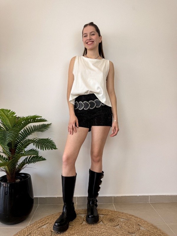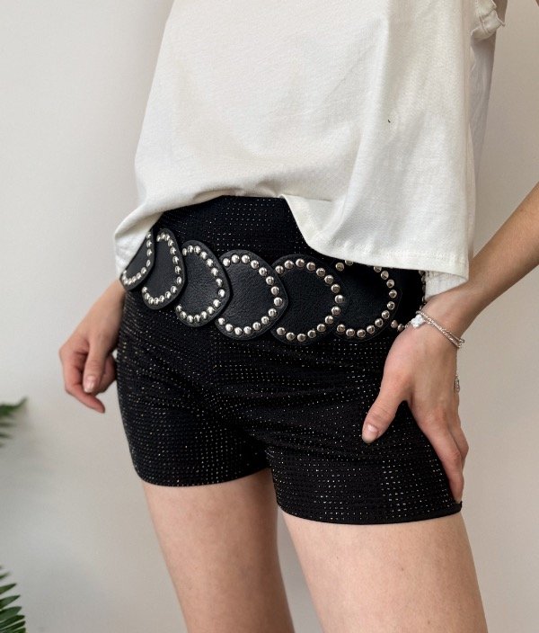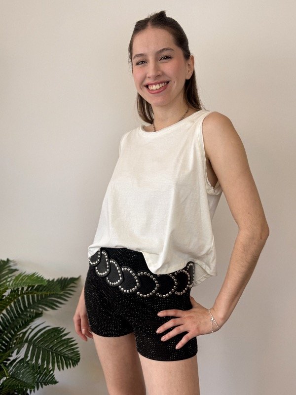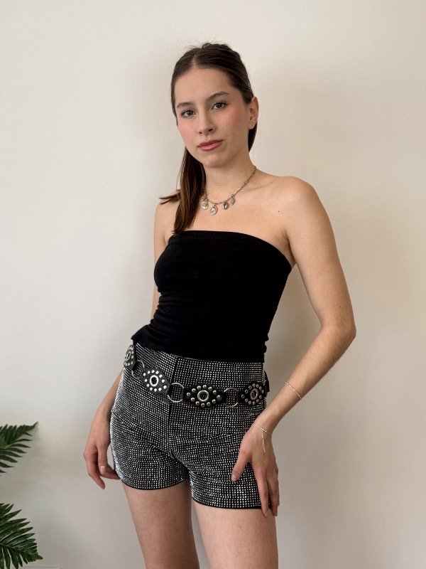 Este short es la combinación perfecta entre comodidad y brillo. Confeccionado en un tejido elástico que se adapta al cuerpo, está completamente intervenido con strass que aportan un efecto luminoso y súper canchero.