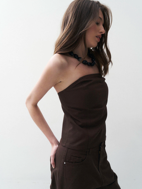 Bando con escote recto y hombros descubiertos. Cierre en espalda con cremallera oculta en costura. Tiene elástico para un mayor ajsute. Combinalo con el baggy YURI