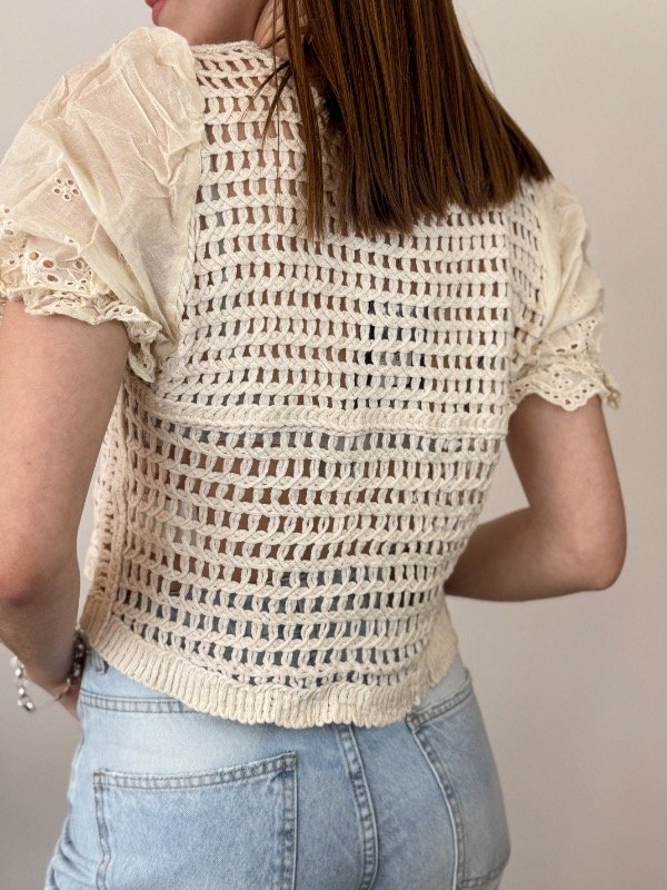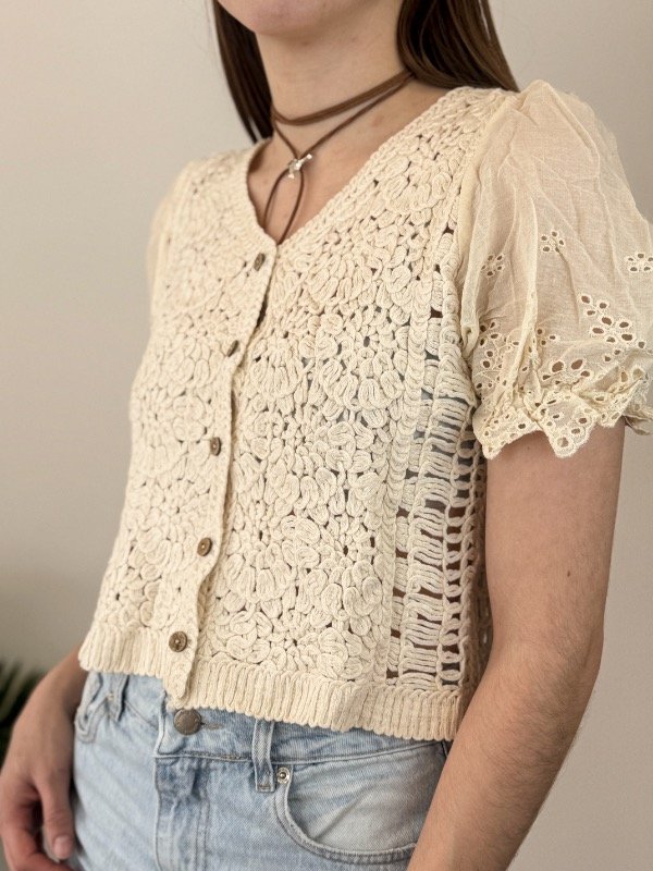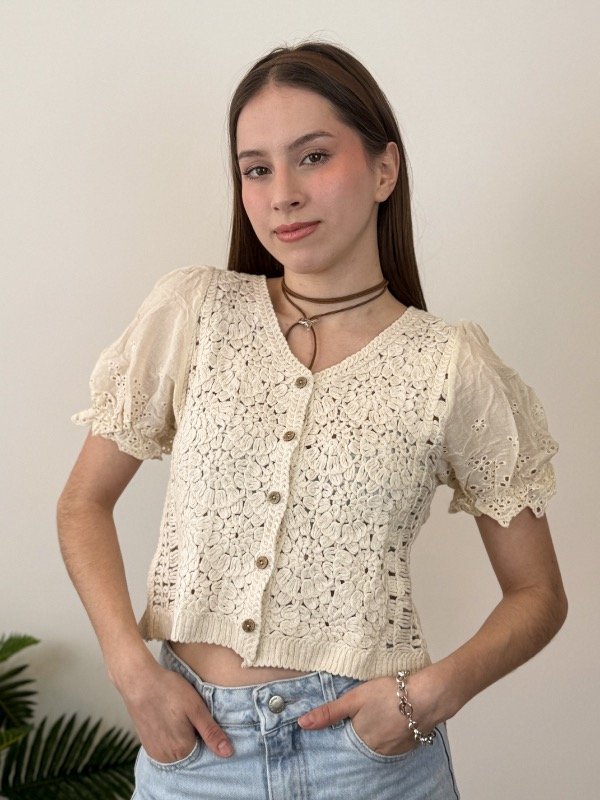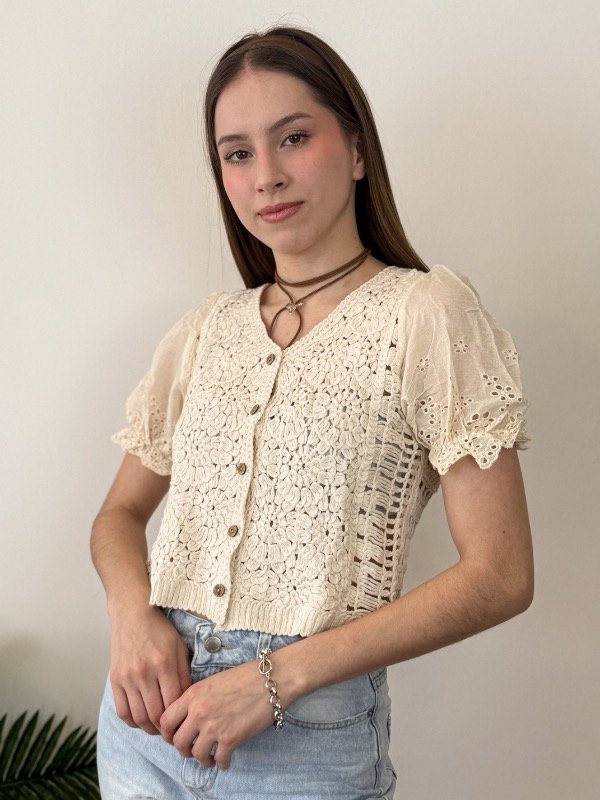 Confeccionada en tejido de hilos de algodón, esta blusa asegura suavidad, frescura y comodidad durante todo el día, convirtiéndose en el aliado perfecto para tus looks de temporada. Las mangas cortas de broderie con elástico aportan un toque romántico y femenino, realzando la silueta con elegancia y distinción. Su cierre frontal con botones facilita el uso y suma versatilidad, permitiendo que adaptes el estilo a cada ocasión.