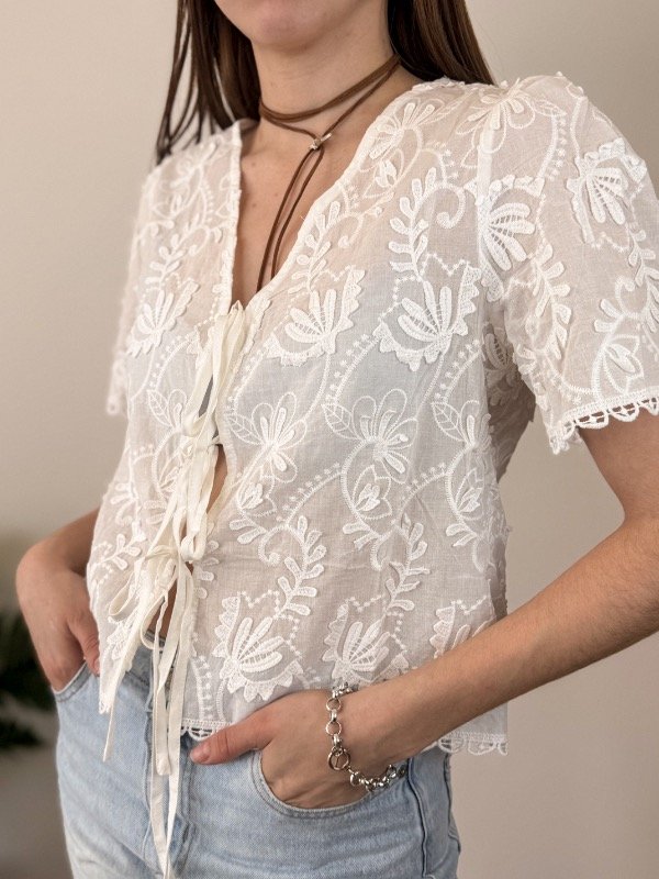 Confeccionada en guipure, esta blusa se destaca por su textura única y sofisticada, perfecta para realzar cualquier look. El cuello en pico aporta un toque femenino y estiliza el escote, mientras que el cierre frontal con tirantes finos para atar permite ajustar la prenda a tu medida, brindando versatilidad y comodidad. Las puntillas en mangas y bajo suman un detalle romántico y artesanal, haciendo de esta blusa una pieza imprescindible para quienes buscan destacar con sutileza y distinción. Ideal para ocasiones especiales o para elevar tus outfits diarios, la Blusa Katnis es la elección perfecta si valorás la calidad, el diseño y los detalles exclusivos.