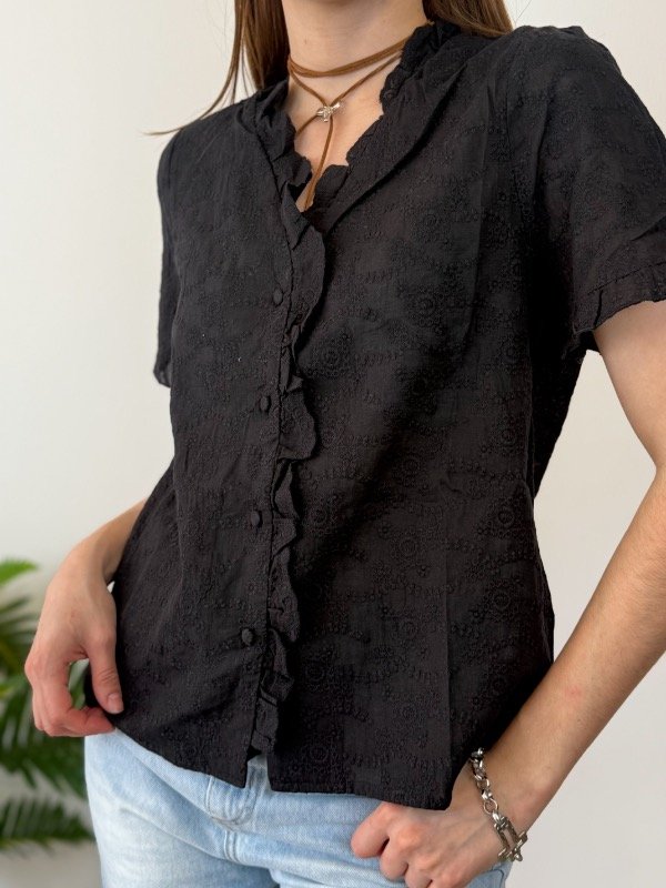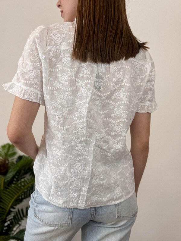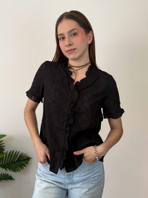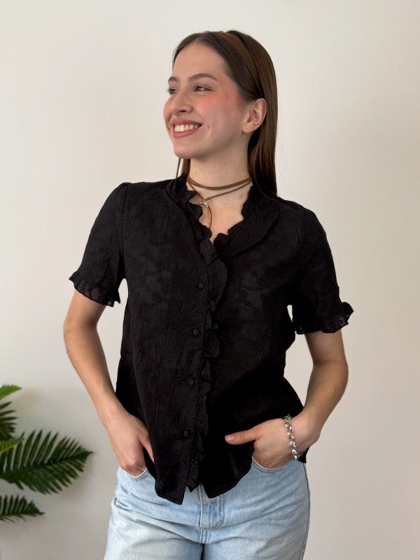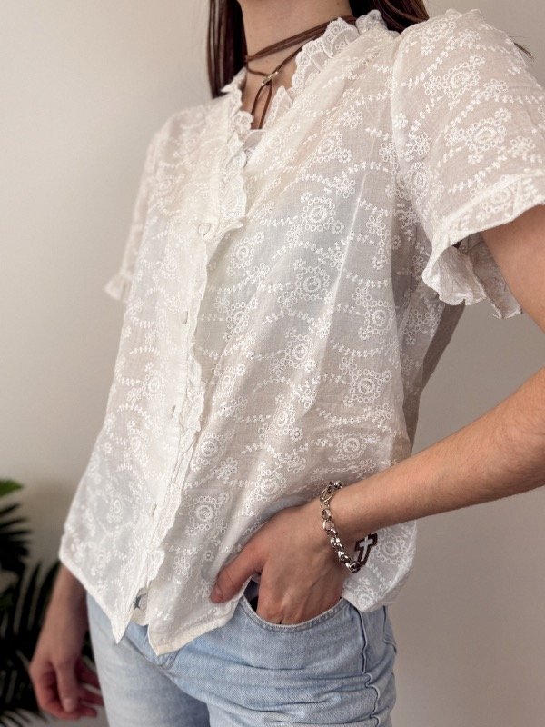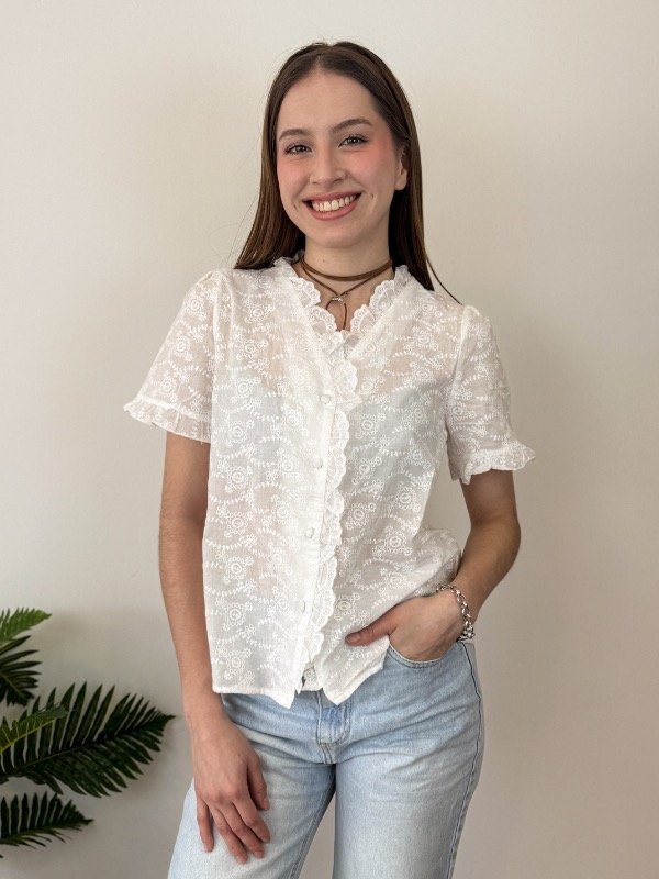 Confeccionada en broderie de alta calidad, esta camisa aporta un aire romántico y sofisticado a cualquier look. Su cuello en V estiliza el escote, mientras que el cierre frontal con botones forrados añade un toque clásico y refinado. El encanto especial de la Camisa Maxine se encuentra en su detalle de vuelos en todas sus terminaciones, que otorgan movimiento y feminidad a la prenda. Ideal para combinar tanto con jeans como con faldas, es perfecta para cualquier ocasión, desde eventos formales hasta salidas casuales.
