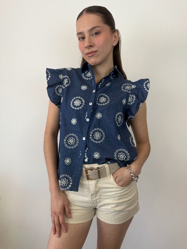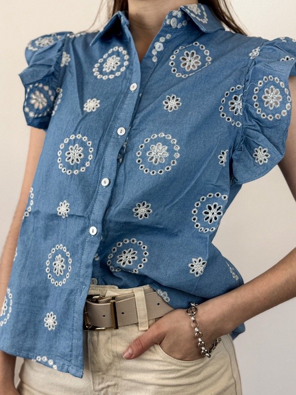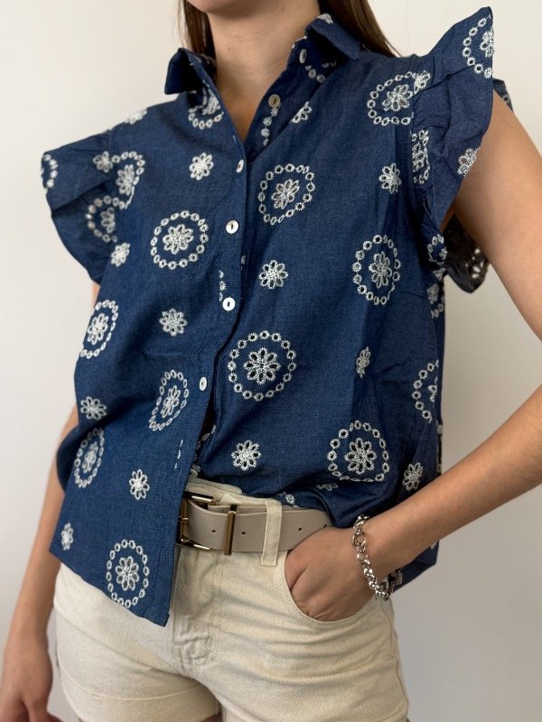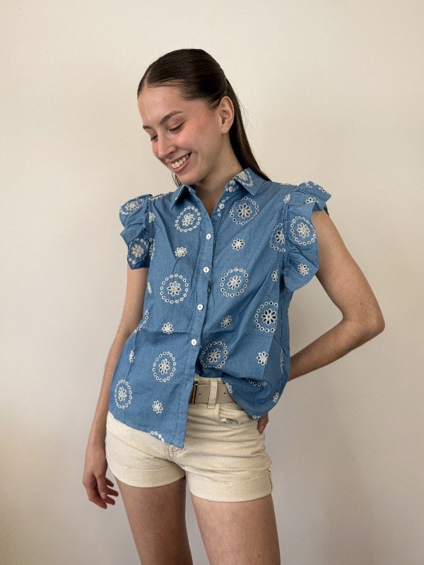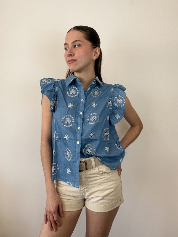 Confeccionada en algodón simil denim, esta camisa ofrece una textura suave y resistente, ideal para acompañarte durante todo el día con el máximo confort. Su cuello clásico aporta un toque atemporal, mientras que el cierre delantero con botones asegura practicidad y un acabado sofisticado. Las mangas sisa con sutil volado suman feminidad y dinamismo al diseño, convirtiendo a la Camisa Otis en una prenda versátil que se adapta tanto a looks casuales como formales. El detalle que la distingue es su delicado bordado con calado, presente en todo su diseño, aportando un aire romántico y distintivo que la hace única. Esta camisa es la opción ideal para quienes buscan calidad, estilo y originalidad en una sola prenda.