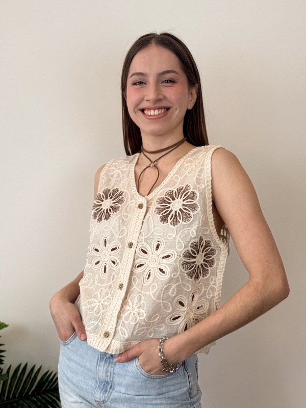 Confeccionado en tejido de hilos de algodón con diseño floral, este chaleco ofrece una textura suave y un acabado delicado que destaca por su originalidad y calidad. El cuello en pico realza la silueta y aporta un toque sofisticado, mientras que la manga sisa asegura libertad de movimiento y confort durante todo el día. El cierre frontal con botones de madera suma un detalle natural y auténtico, completando un diseño versátil y atemporal.Ideal para combinar con tus prendas favoritas, el Chaleco Aslan es la opción perfecta para quienes buscan una prenda distintiva, cómoda y fácil de adaptar a diferentes estilos.