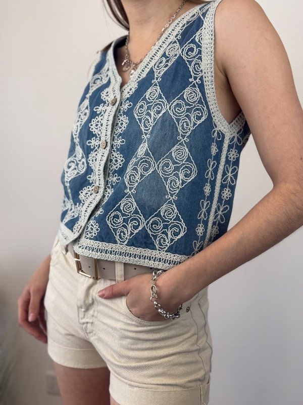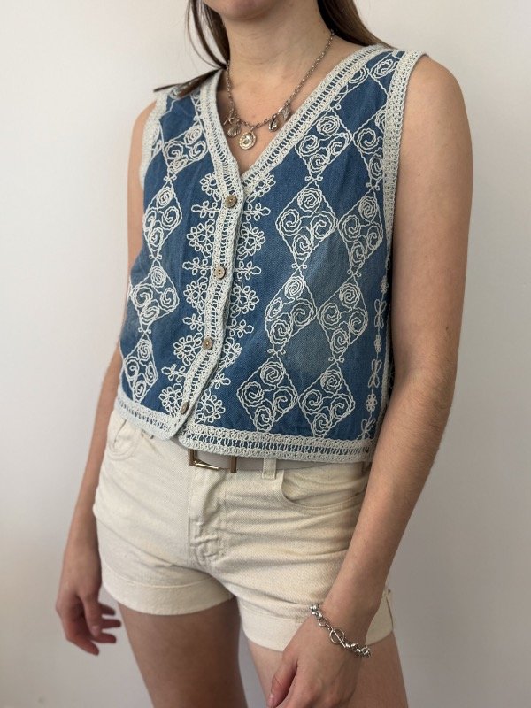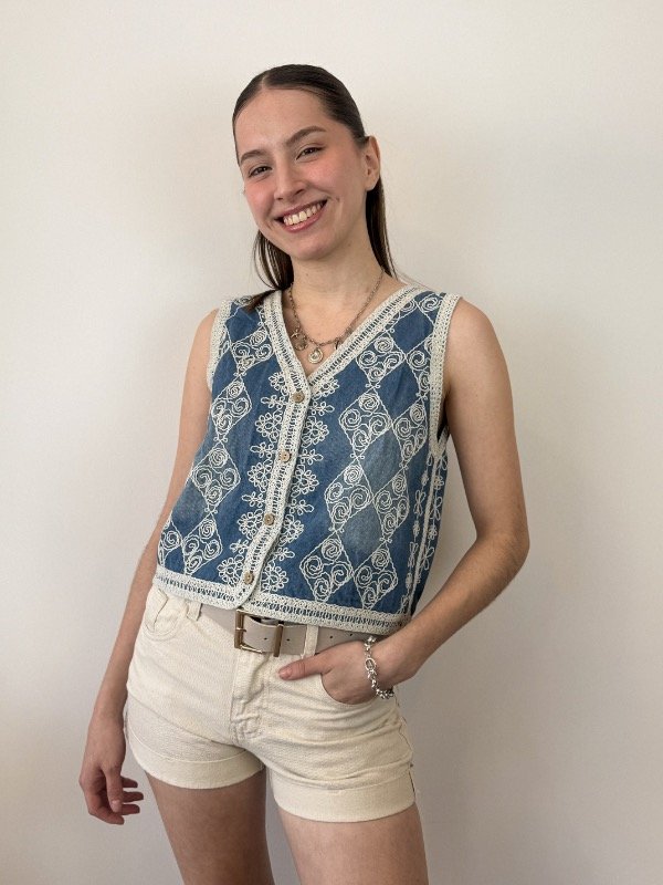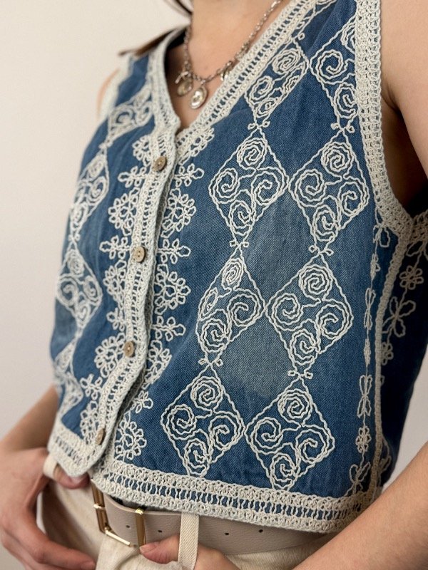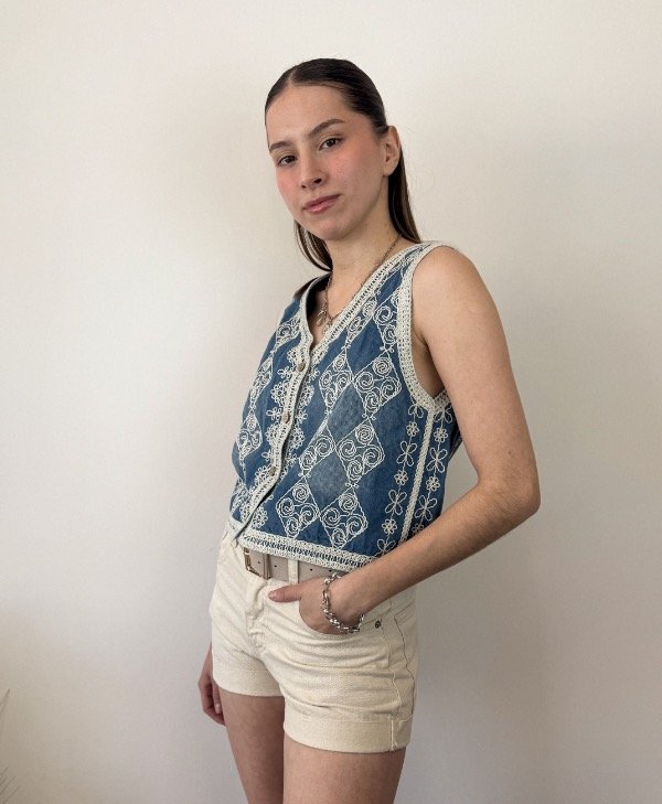 Confeccionado en denim camisero, este chaleco se destaca por su textura suave y estructura liviana, ideal para complementar tus looks durante toda la temporada. Su diseño incorpora bordados realizados con hilos de algodón, aportando detalles exclusivos que realzan tu estilo personal. La manga sisa brinda frescura y libertad de movimiento, mientras que el cierre frontal con botones de madera añade un toque natural y distintivo.