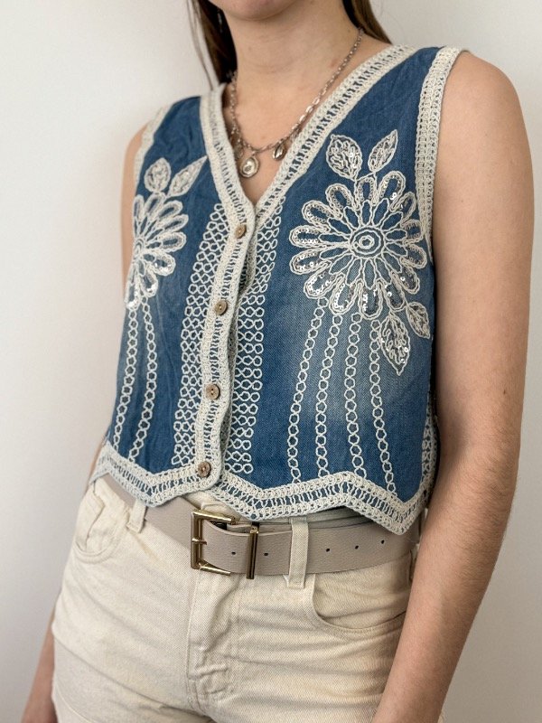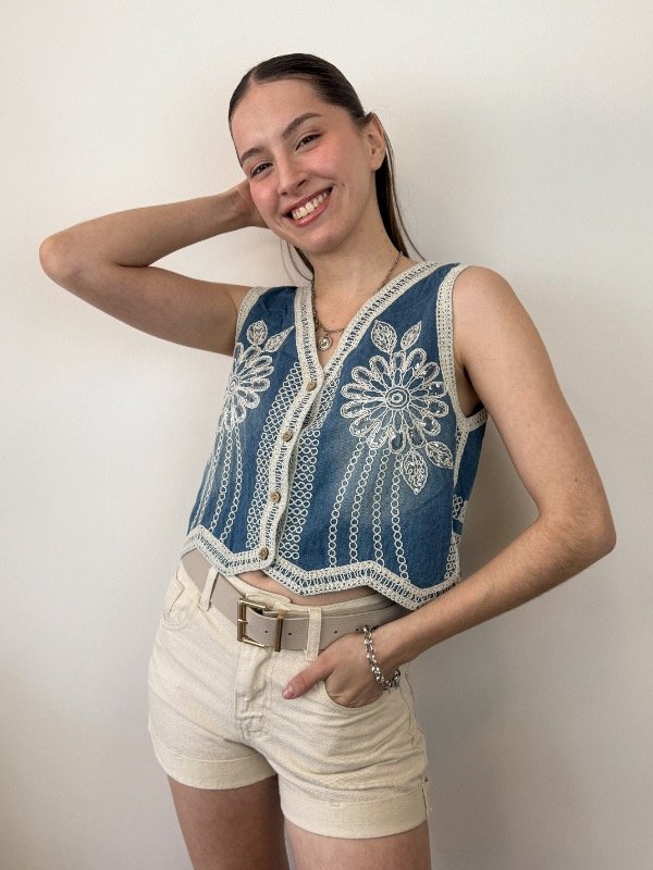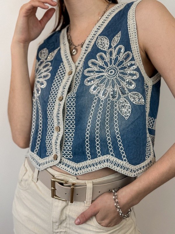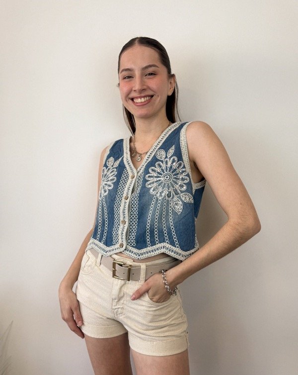 Confeccionado en denim camisero, este chaleco se destaca por su textura suave y estructura liviana, ideal para complementar tus looks durante toda la temporada. Su diseño incorpora bordados realizados con hilos de algodón y lentejuelas, aportando brillo sutil y detalles exclusivos que realzan tu estilo personal. La manga sisa brinda frescura y libertad de movimiento, mientras que el cierre frontal con botones de madera añade un toque natural y distintivo. Perfecto para quienes buscan destacar con elegancia y comodidad, el Chaleco Tanya es la opción ideal para elevar cualquier conjunto.