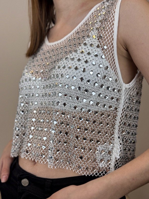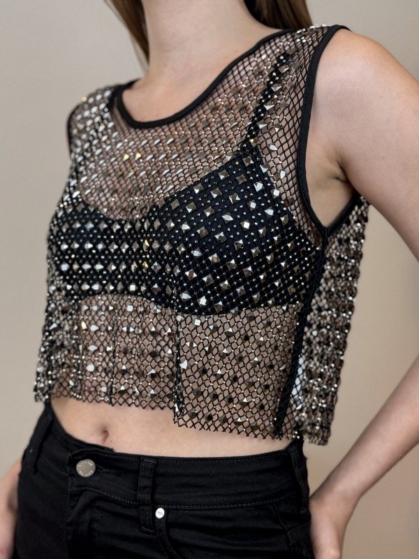 Diseñada para quienes buscan destacar, esta musculosa está confeccionada en tela de red. Su cuello redondo clásico realza la silueta y la convierte en una pieza versátil, mientras que la manga sisa otorga libertad de movimiento y un aire moderno. El diseño de tejido abierto no solo aporta originalidad, sino que permite jugar creativamente con superposiciones y accesorios. Lo que realmente diferencia a la Musculosa Britney son sus apliques hotfix de strass distribuidos en todo su diseño: cada detalle de brillo resalta tu personalidad y suma un destello sofisticado a tu look. Además, la terminación en cuello y sisa con bies de tela reforzada garantiza durabilidad y un acabado de calidad.