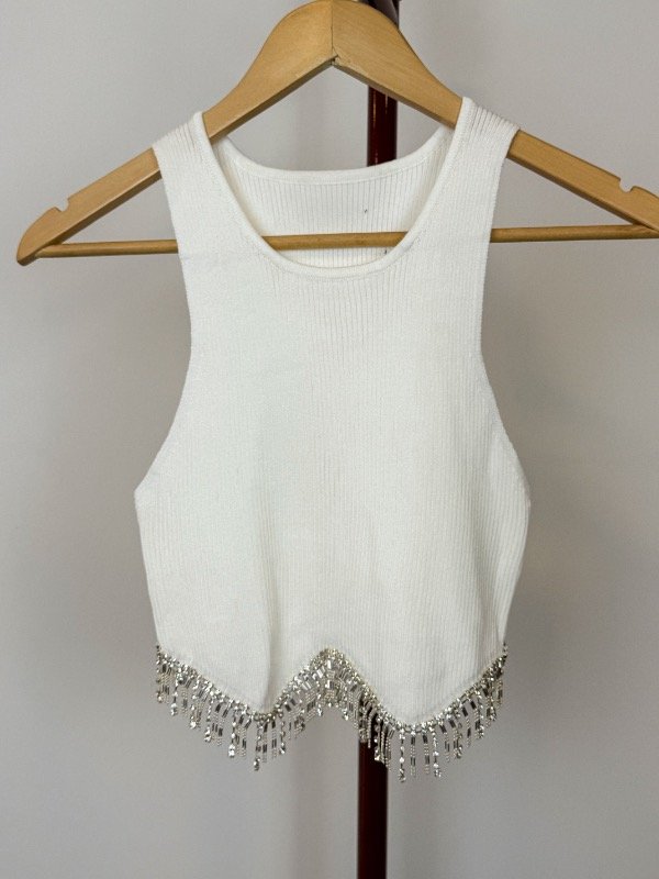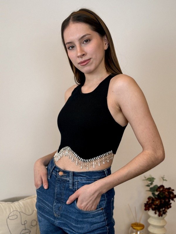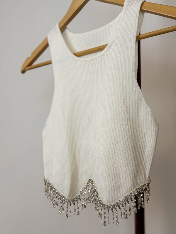 Confeccionada en hilo sintético, esta musculosa ofrece una textura suave y liviana que se adapta perfectamente a tu silueta. Su tejido punto morley garantiza una excelente elasticidad y una caída delicada que realza la figura, proporcionando comodidad durante todo el día. El cuello redondo clásico aporta un toque atemporal y versátil, mientras que la manga sisa permite libertad de movimiento y frescura, convirtiéndola en la elección perfecta tanto para looks casuales como para ocasiones especiales. La terminación en bajo con ondulaciones agrega dinamismo y modernidad, elevando el diseño con un detalle visual único. Además, los apliques de pedrería y strass colgantes iluminan la prenda, aportando ese brillo sutil pero cautivador que transforma cualquier conjunto.