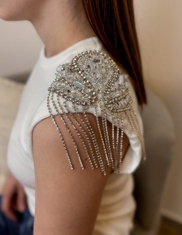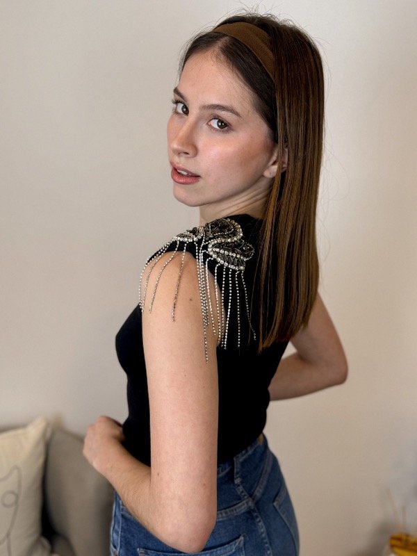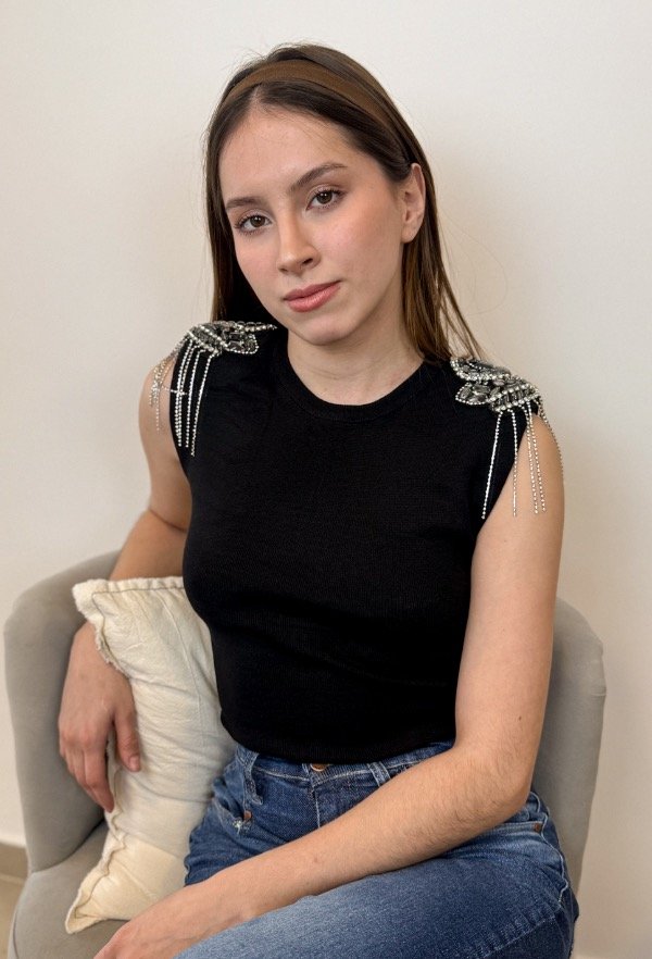 Ideal para quienes buscan destacar con un toque de elegancia en cualquier ocasión, esta musculosa está confeccionada en hilo sintético, brindando una textura suave y fresca que acompaña todos tus movimientos. El diseño de cuello redondo resalta la silueta de manera sutil y refinada, mientras que la manga sisa garantiza comodidad y libertad, perfecta para los días más cálidos. Lo que realmente distingue a la Musculosa Valkyria es el exclusivo detalle de charreteras en los hombros, realzadas con apliques de pedrería y strass. Este acabado aporta un brillo sofisticado y femenino, transformando una prenda básica en un ícono de estilo que no pasa desapercibido. La Musculosa Valkyria es la elección ideal para quienes desean sumar glamour y modernidad a sus looks diarios o para ocasiones especiales.