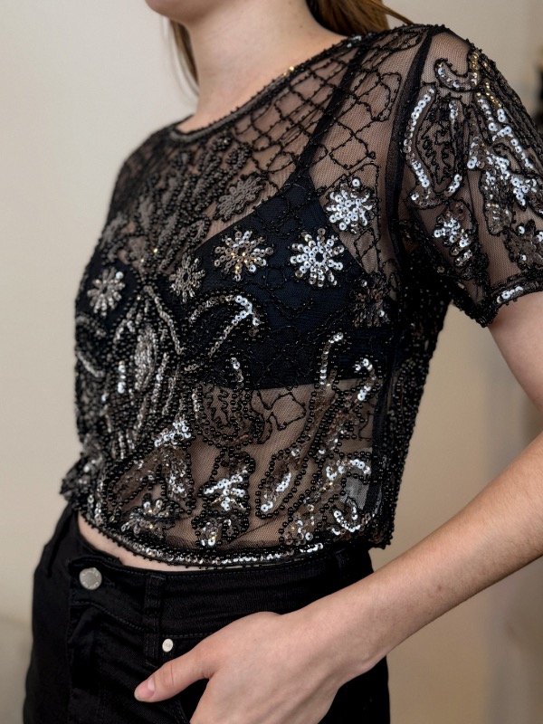 Confeccionada en microtul, esta remera se convierte en la opción ideal para quienes buscan destacar con elegancia y un toque de brillo sutil. El cuello redondo realza la silueta y aporta un acabado sofisticado, mientras que las mangas cortas aseguran frescura y libertad de movimiento en cualquier ocasión. Su detalle exclusivo de cierre de cremallera en la espalda no solo facilita su uso, sino que suma modernidad y estilo a una prenda pensada para sorprender. Sin dudas, el mayor atractivo de la Remera Janet es su bordado de mostacillas y lentejuelas que recorre todo el diseño, brindando un efecto luminoso y refinado que realza cualquier look, tanto de día como de noche.