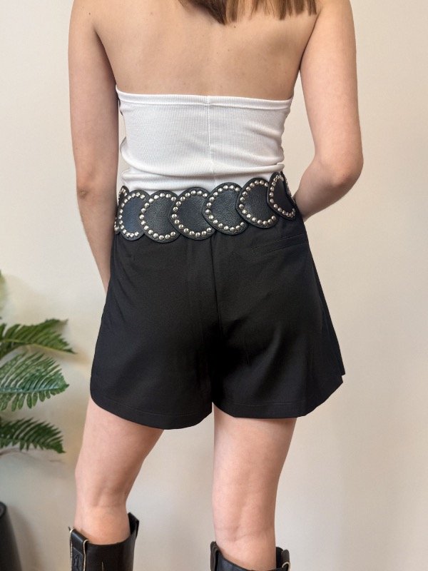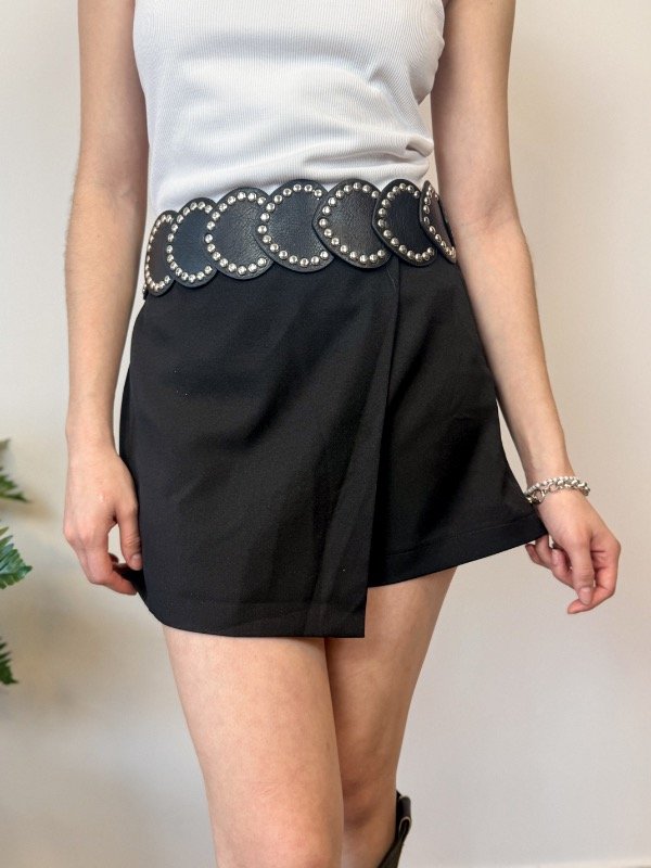 Skort con sobrefalda inclinada. Bolsillo ojal no funcional. Elástico en la espalda con formato short. Cierre lateral con cremallera.