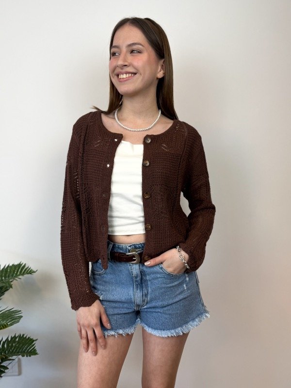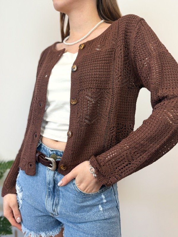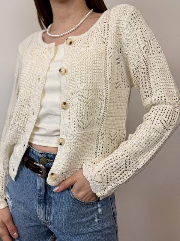 Descripción : Cardigan manga larga de escote redondo de trama calada con terminación. Cierre frontal con botones.