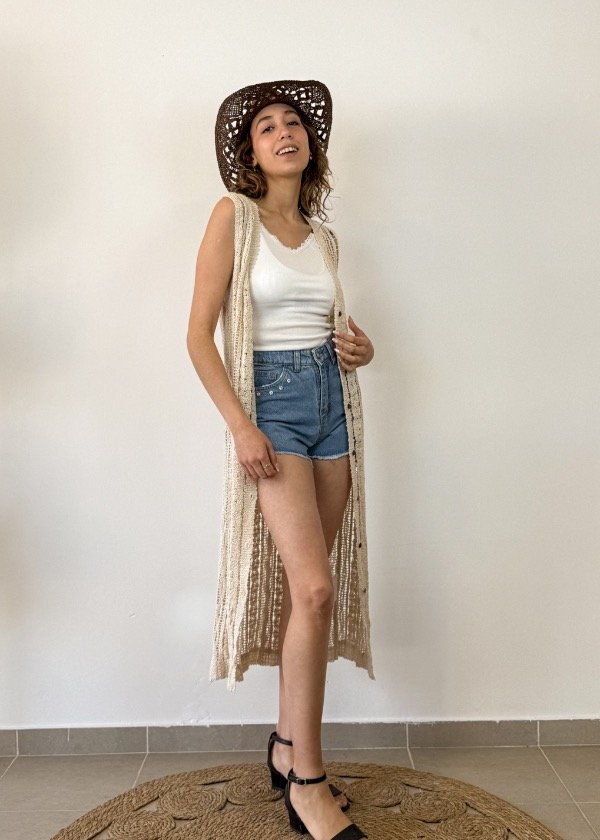 Presentamos el Vestido Aniza una pieza que reinventa la frescura y la sofisticación en cada detalle, pensado para acompañarte en los días más cálidos con un estilo inconfundible. Confeccionado en hilo de algodón, este vestido garantiza una textura suave y una comodidad excepcional. Su escote en pico realza el cuello y aporta un toque femenino y moderno, mientras que las mangas sisa aseguran libertad de movimiento y frescura en cada ocasión. El cierre delantero con botones de madera no solo suma funcionalidad, sino que también aporta un detalle natural y distintivo al diseño, evocando una estética artesanal y auténtica. El diseño de tejido calado se convierte en el protagonista de la prenda, creando un efecto visual delicado y aireado, perfecto para destacar tu estilo en eventos especiales o en salidas casuales. Este vestido es la elección perfecta para quienes aprecian las prendas versátiles y atemporales.