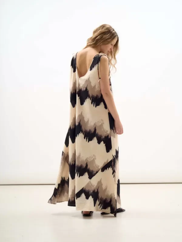 Descripción : Maxi vestido de escote delantero y espalda en V. Bretel con lazos para ajustar y con terminales de madera.