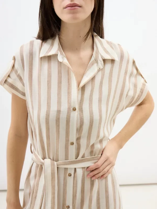 Descripción : Vestido largo de cuello camisa. Apertura frontal con botones. Manga corta con presillas a botón. Tajos laterales y con lazo a la cintura.