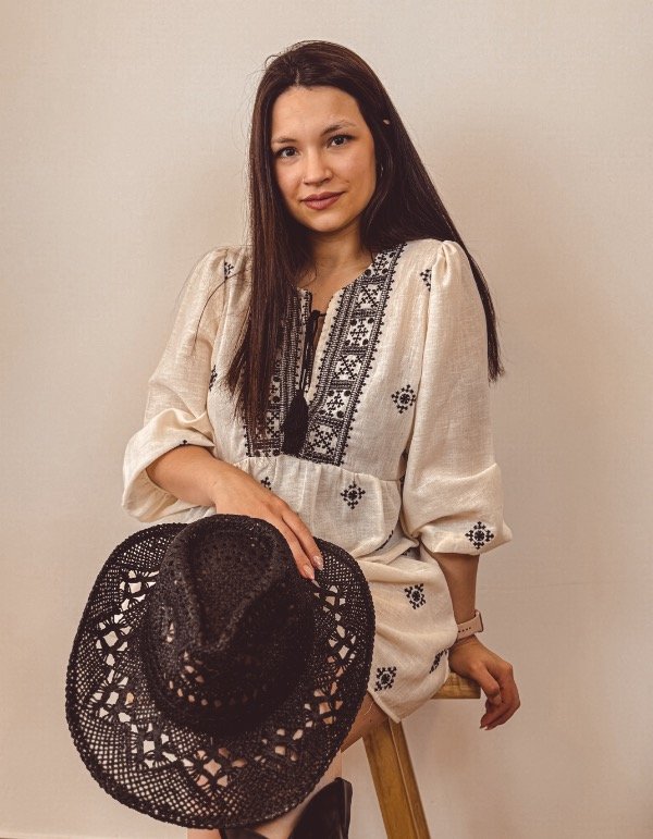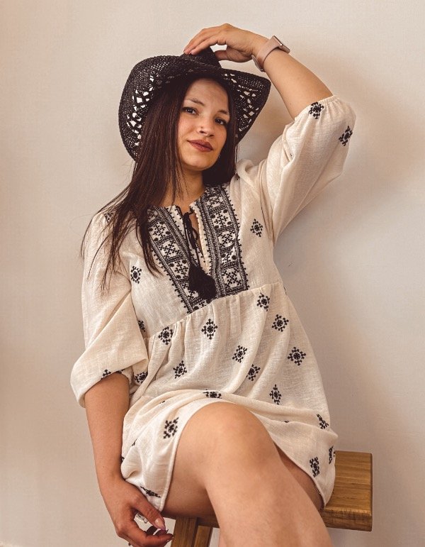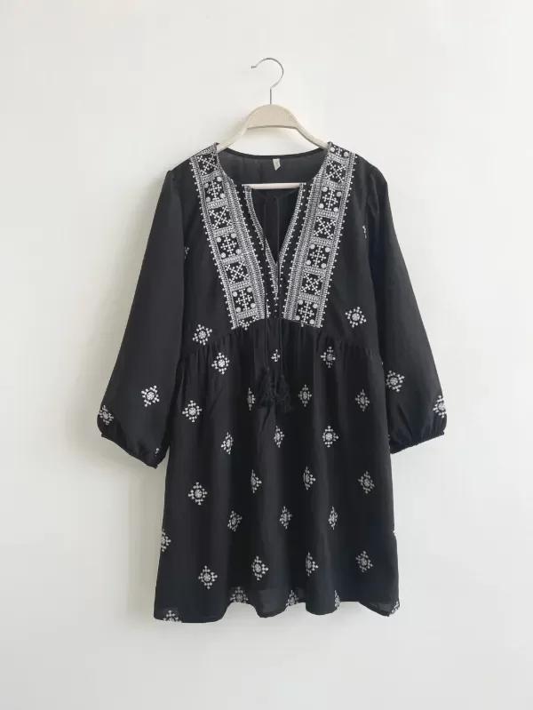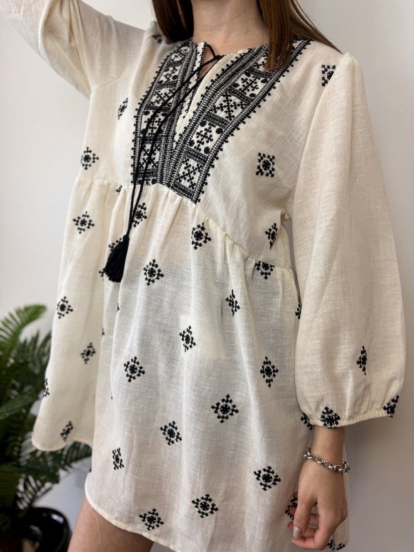Descripción : Vestido corto de manga globo 3/4 con elástico en los puños. Escote delantero en V con cordón con terminación. Falda con vuelo fruncido.