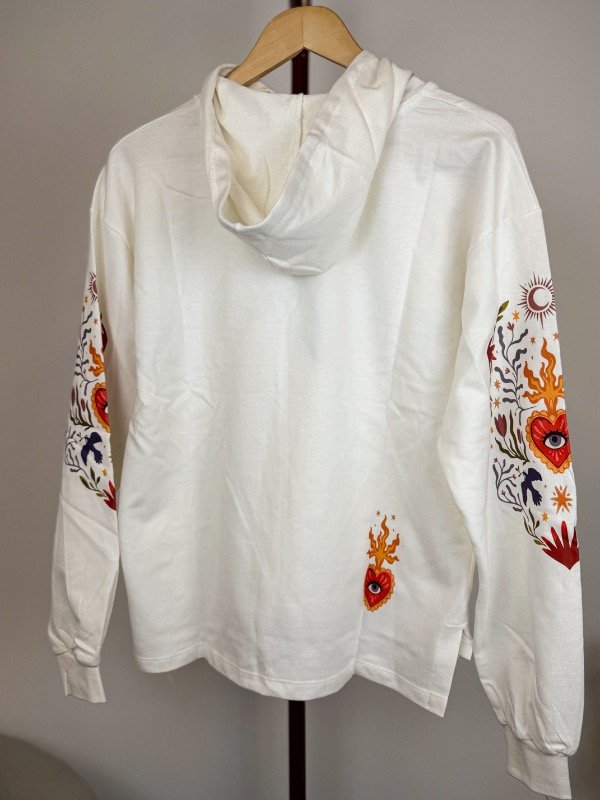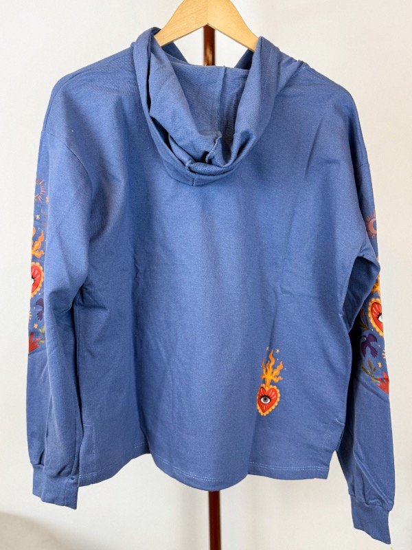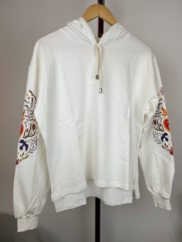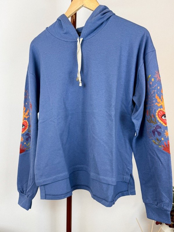 Buzo de rústico 100% algodón, con capucha, estampado en las mangas y la capucha. Más corto adelante que atrás.