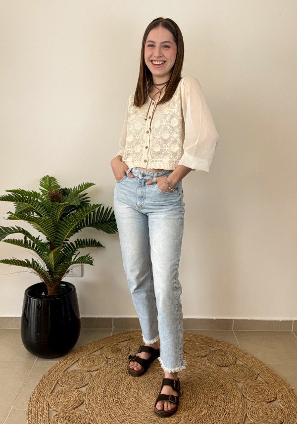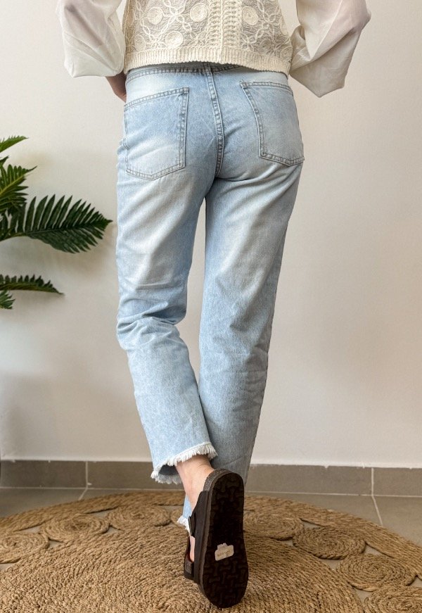 Confeccionados en denim rígido de alta calidad, estos jeans aseguran estructura y durabilidad, logrando una silueta favorecedora y moderna. El tiro alto resalta la cintura y estiliza la figura, mientras que el lavado claro es ideal para cualquier estación. El detalle distintivo está en el bajo acabado sin costuras con flecos, que añade movimiento y personalidad a cada paso. Su diseño recto se adapta a diferentes estilos y permite infinitas combinaciones, convirtiéndose en un básico imprescindible para quienes buscan destacar con sofisticación y tendencia.